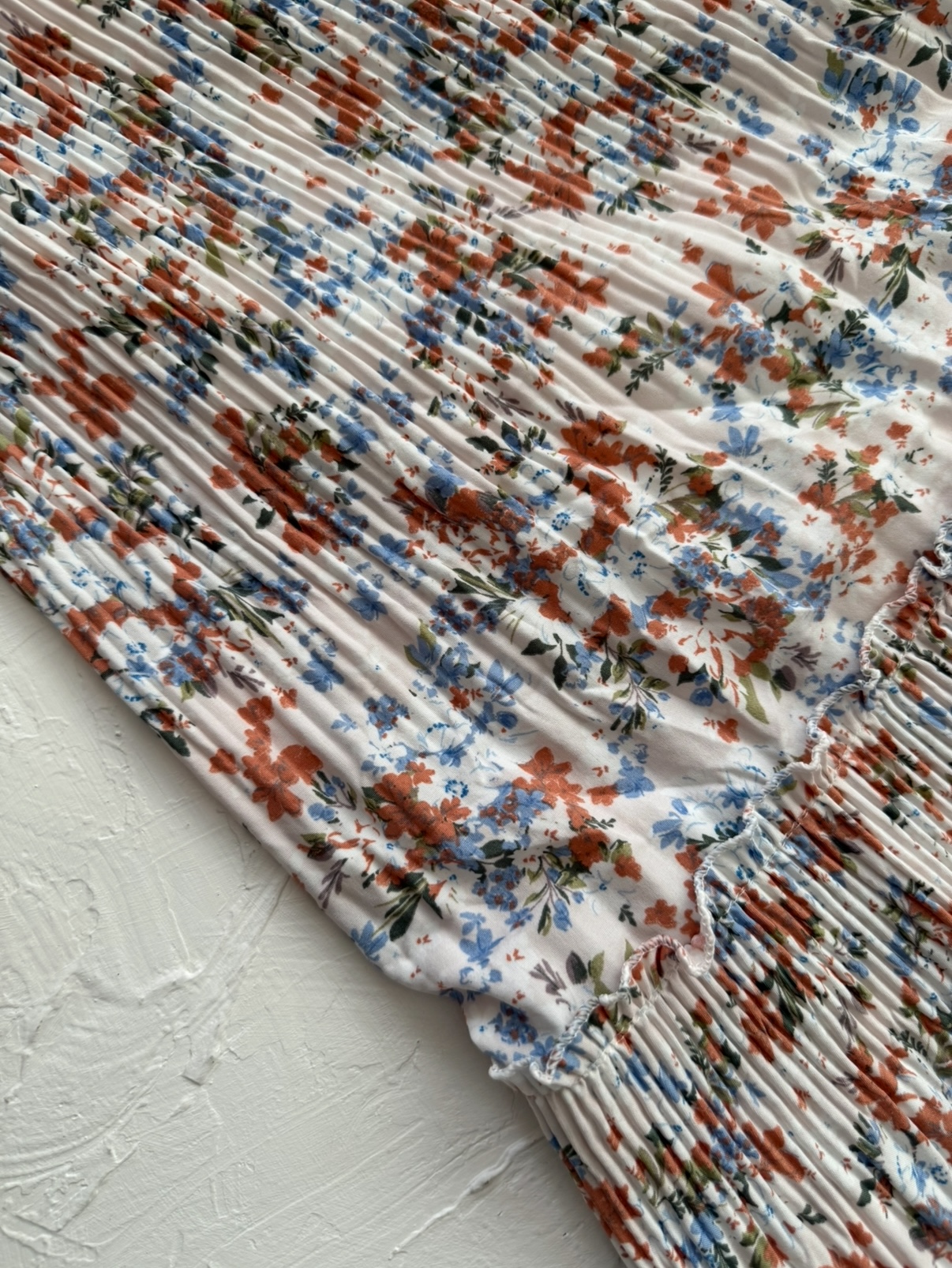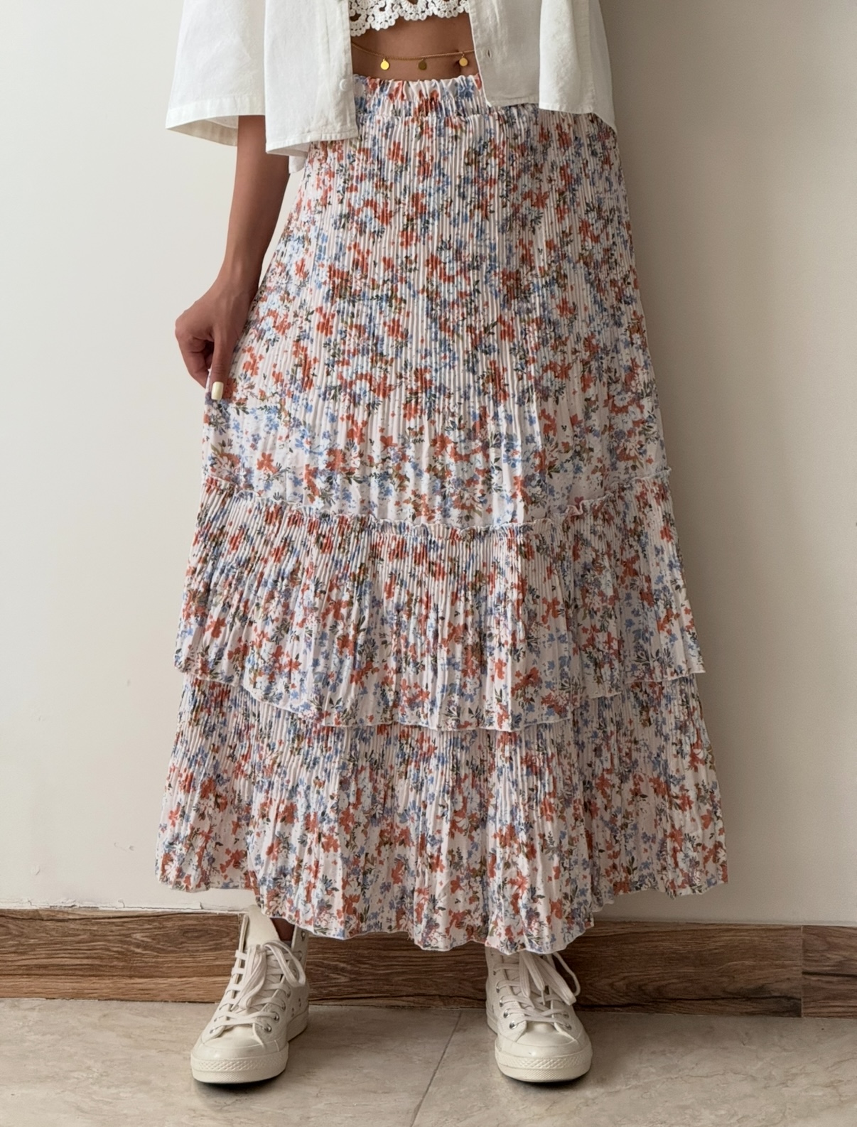 دامن گلدار وارداتی مدل پیلیسه تک رنگ زمینه سفید با گل آبی و نارنجی آستر دار فری سایز مناسب سایز(۳۴تا۴۴) قد ۹۰